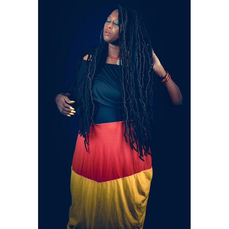 Vestido largo negro rojo y amarillo