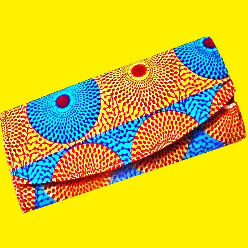 Acheter en ligne pochette ethnique chic en tissu Wax bleu et orange pour illuminer vos journées et vos soirées. Avec sa touche d'originalité, cette pochette se porte de jour, comme de nuit