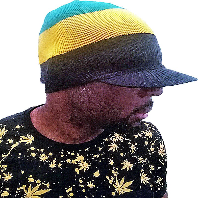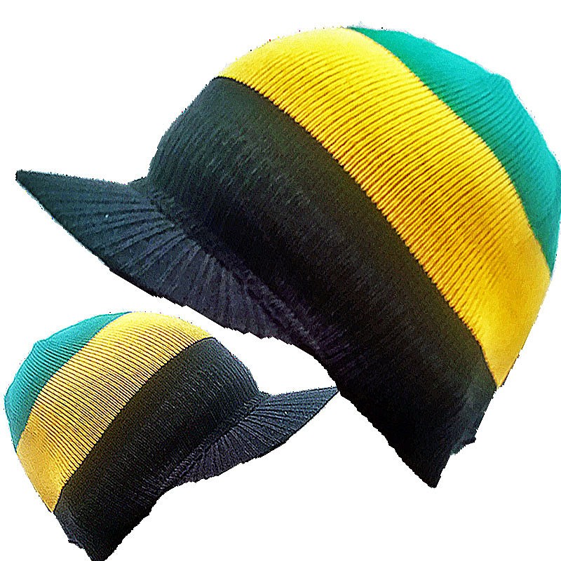 Black Jamaica Rasta peak visor hat with yellow green stripes
